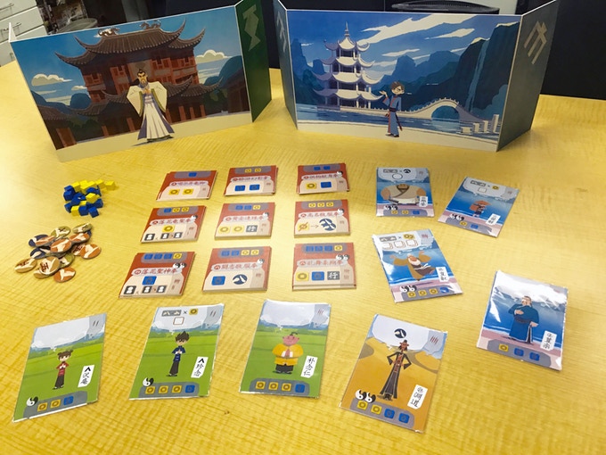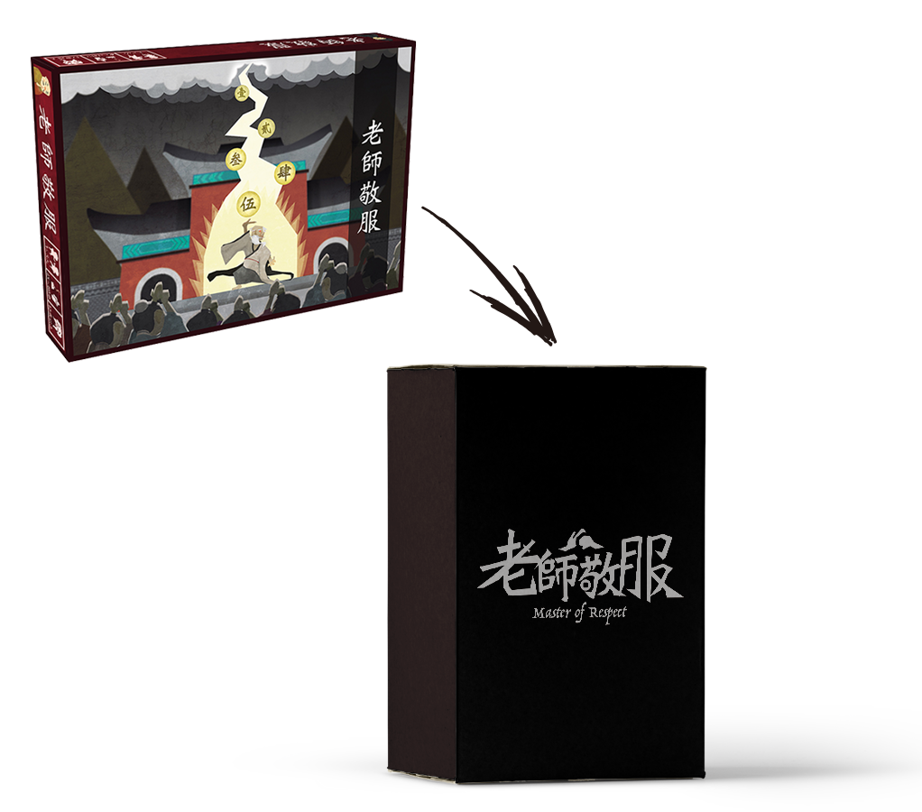"老師敬服"は、道場を経営する老師となり、弟子たちを育てて道場を大きくすることが目的のゲーム。ただし、他の老子からの敬服が得られなければ、勝者となることは難しい。ゲームマーケット2016秋で頒布されたゲームが、ホビージャパンの監修によりリメイクされ、キックスターターに登場した。